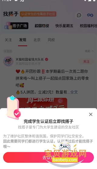 3、如果尚未完成学生认证,系统会提示【完成学生认证后立即找搭子】,点击【去认证】完成身份验证。认证通过后,按照页面指引填写闲置物品信息并上传图片,即可发布闲置物品。