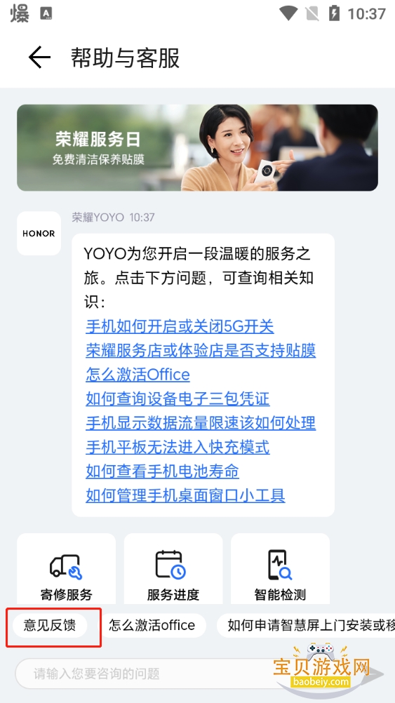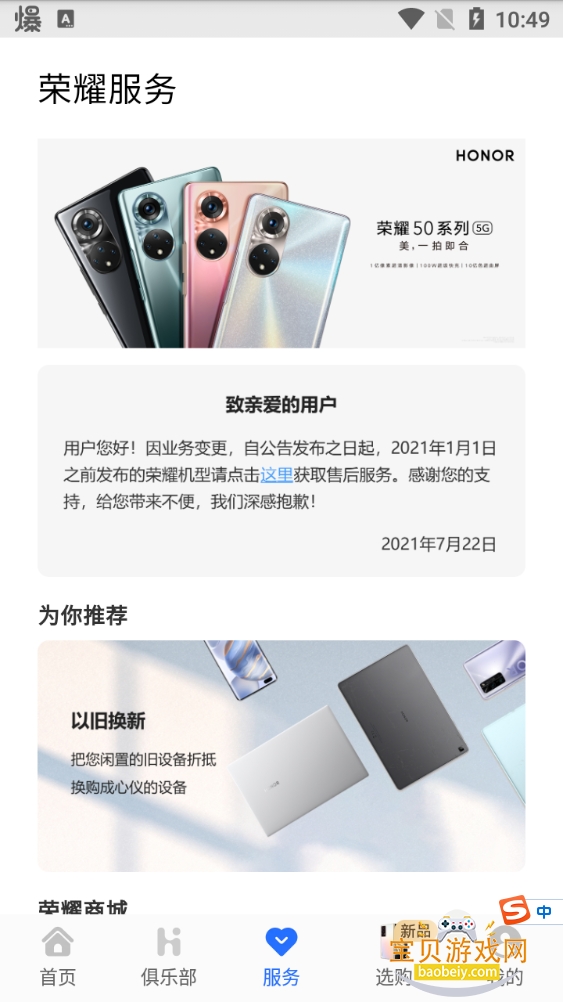 3、在【服务】,软件为用户提供了很多荣耀产品的售后服务,比如以旧换新、查询服务门店、在线客服等;