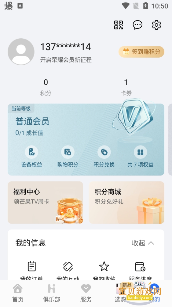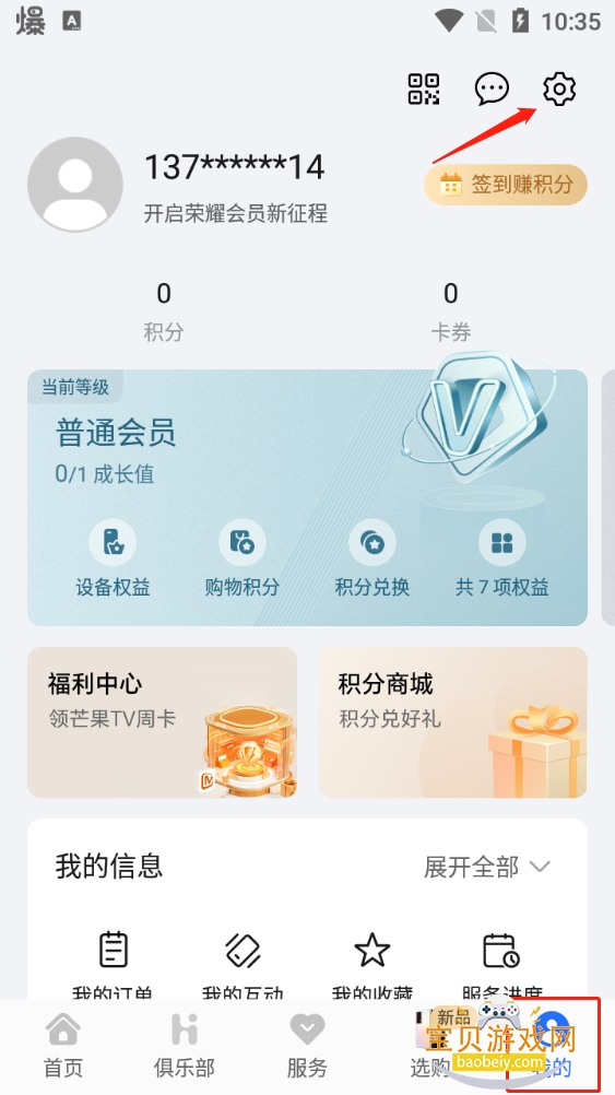 4、点击我的,可以查看设备权益、购物积分、积分兑换等权益,还可以查看订单、互动、收藏等;