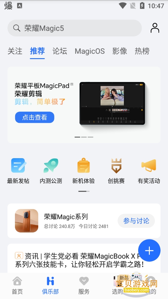 2、点击【俱乐部】,可以搜索有关荣耀产品的帖子,也可以自己发帖,点击旁边的【+】即可;