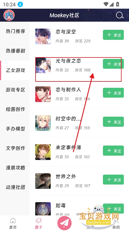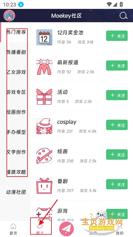 1、进入【圈子】板块,筛选喜欢的类目