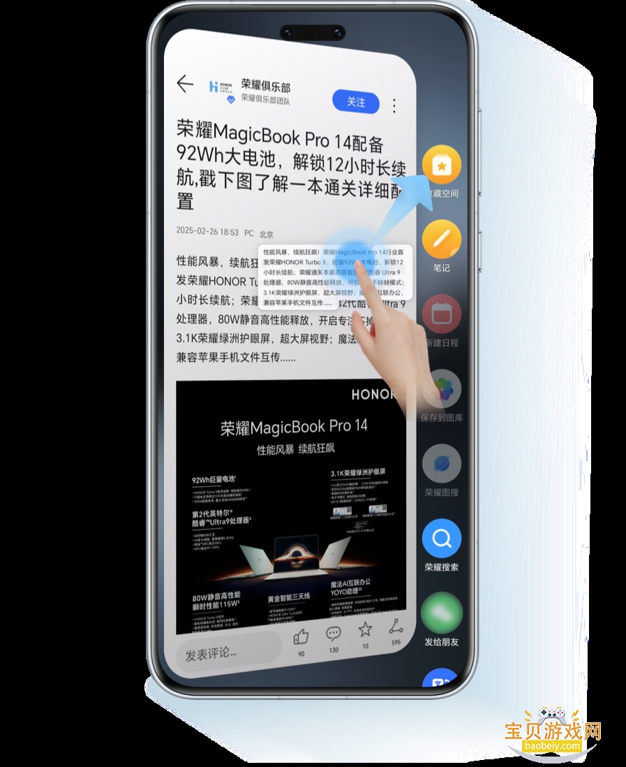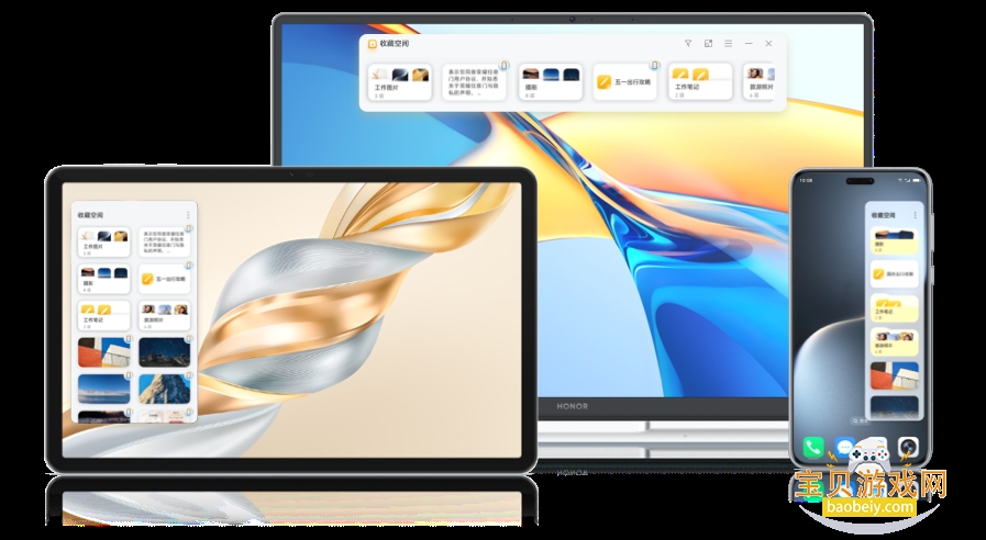 手机/平板收藏的网页/图片等素材,可再电脑上直接拖拽使用,通过荣耀信任环实现多设备生态融合。