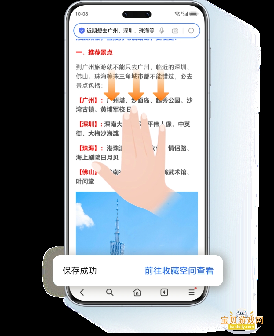 浏览网页时,三指下滑,海量攻略轻松收藏,并自动过滤广告,即使原网页链接失效,也可随时查看,攻略一目了然,自在出行。