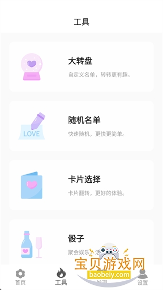 4、点击底部【工具】栏,可使用大转盘、随机名单、骰子等辅助功能,丰富游戏形式,提升互动乐趣。