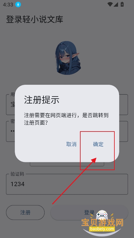 2、新用户直接点击注册,【确定】跳转到网页进行注册