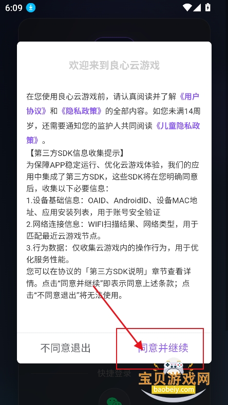 1、在宝贝游戏网下载安装良心云游免费版,点击【同意并继续】