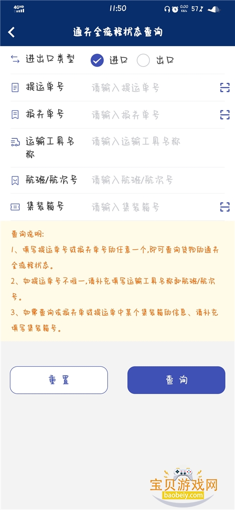 进入通过状态查询页面后,输入提运单号、报关单号等信息,然后点击【查询】功能。