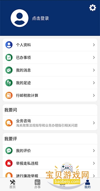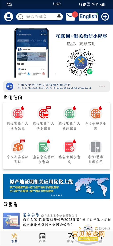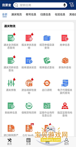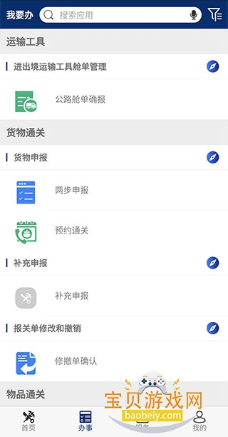 2、【办事】页面为用户提供了各种各样的事项办理业务,例如运输工具类、货物通关类、物品通关类等。