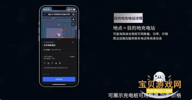 操作:地点>目的地充电站,可查询具体充电桩可用数量、功率、价格,周边设施及服务联系电话等具体信息。