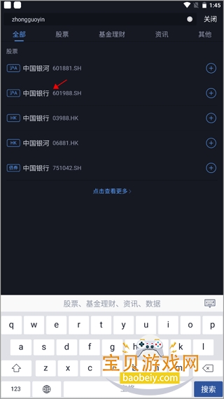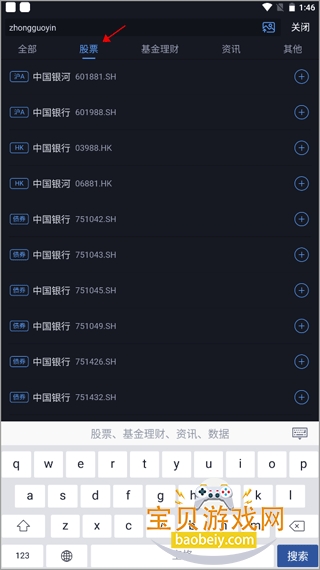 3、选择股票,在出现的搜索结果中选择我们要找的股票。