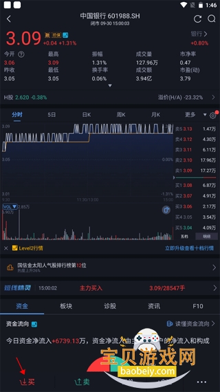 4、进入股票详情后,可看到股票的基本信息。如需买入,点击左下角的“买”。