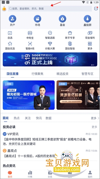 1、打开国信金太阳app,在首页上方的搜索框中输入我们想要查找的股票名称或者股票代码。