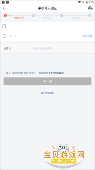 3、输入手机号和验证码进行验证,勾选用户协议,进入下一步。