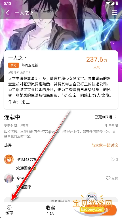 4、然后进入喜欢的漫画界面,点击左下角缓存即可