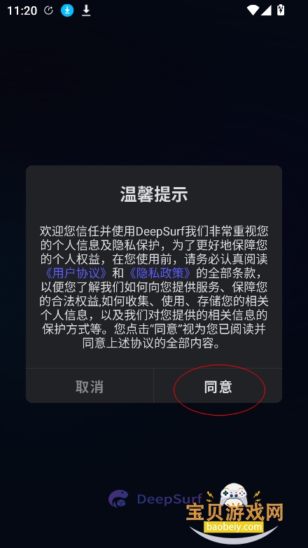 1、在宝贝游戏网下载安装DeepSurf安卓手机版,点击【同意】进入