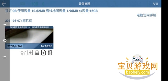 4、在这个界面中上部是APP所录制的录像的总大小,以及其中被锁定的录像的总大小。所有的录像都是按日期排列的,同一天的录像是“新的在前旧的在后”。每一段录像下方有几个功能按钮,从左往右分别是轨迹显示、压缩视频、锁定视频、导出视频到相册和删除录像。