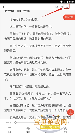 3、进入到小说阅读页面,点击空白处,就会弹出很多功能,右上角有一个耳机的图案。