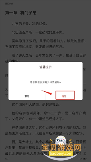 4、第一次使用的话会出现一个语音朗读流量的消耗,点击“确定”就可以了。