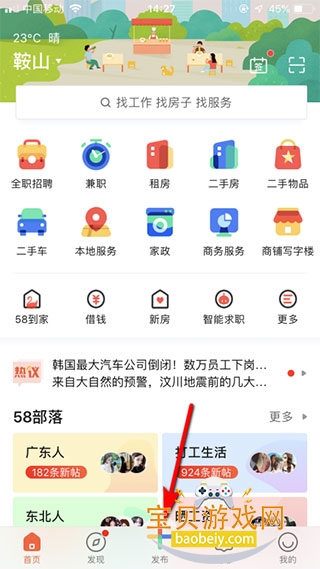 1、打开58同城app,进入首页,点击下方“+”发布按钮,如下图所示: