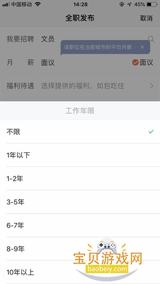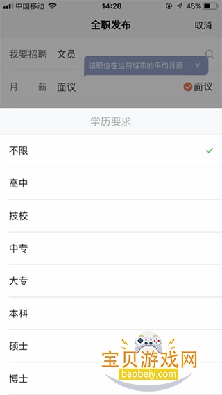 5、填写完需要的职位,以“文员”为例,进入职位相关要求页面,填写月薪(或面议),如下图所示: