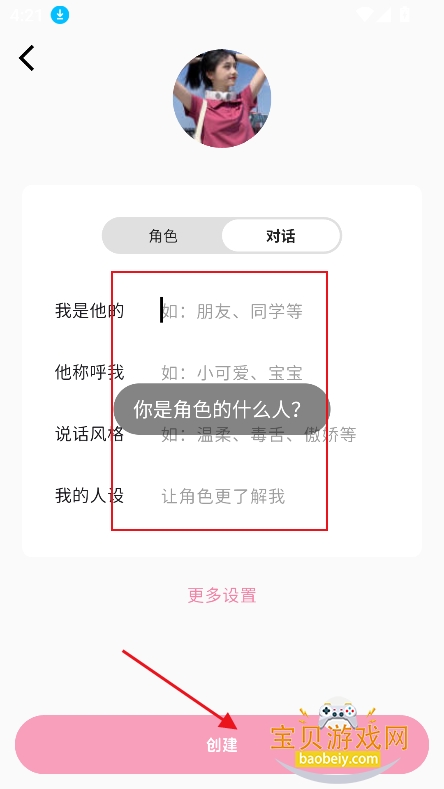 2、输入角色昵称,性别,人物设定等参数