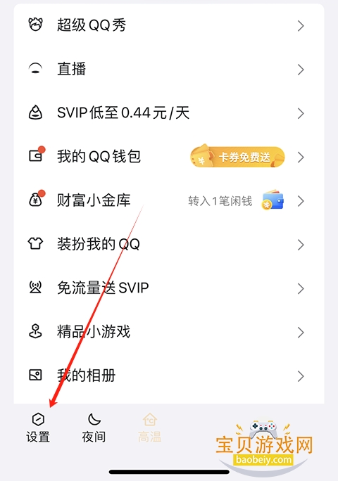 进入设置界面:打开手机QQ,点击左上角的头像进入个人中心页面,然后点击底部的“设置”选项。