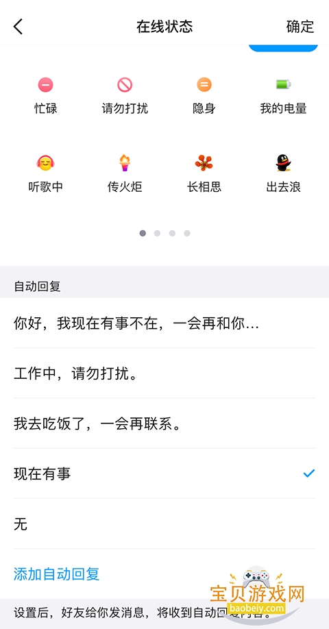 5、选择离开选项,点击一下。可以看到下面有自动回复的选项可以选择,可以自行选择。