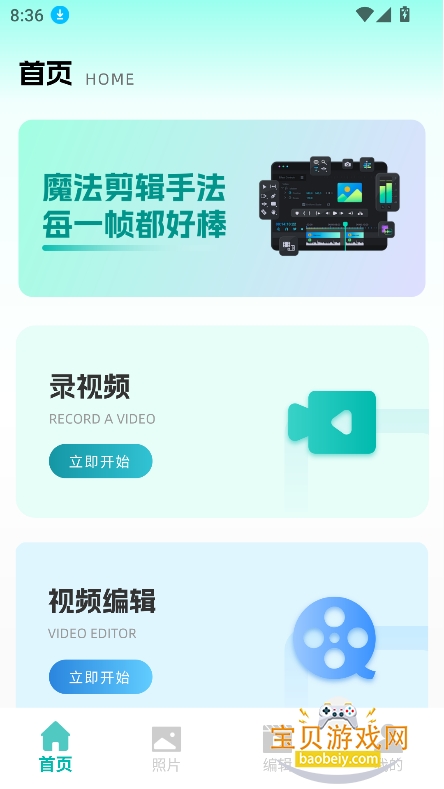 1、进入首页,提供录视频,视频剪辑,视频备份等功能,任意选择需要的功能