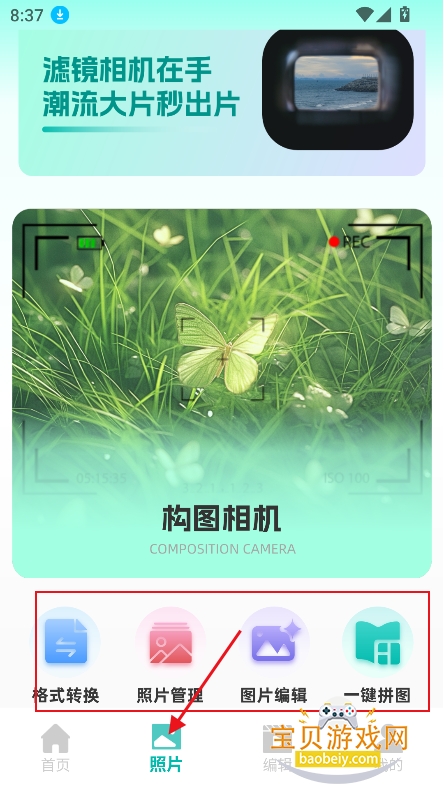 2、进入【照片】板块,提供格式转换,拼图,照片管理,图片编辑等功能