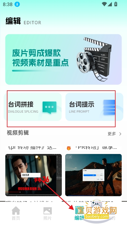 3、进入【编辑】板块提供台词拼接,台词提示等功能