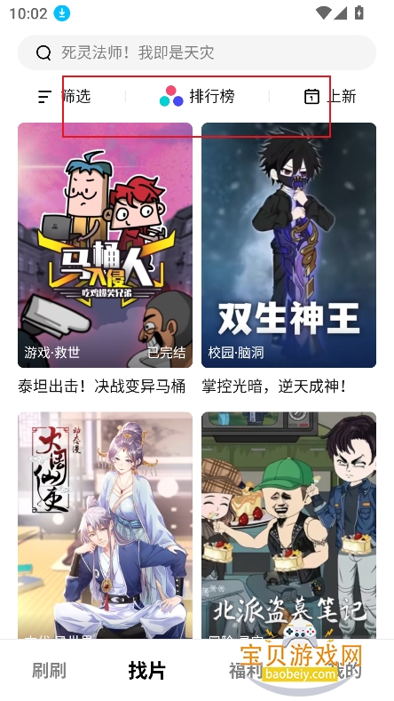 2、进入【找片】可以根据排行榜,最新热门等关键词,筛选喜欢的漫剧内容