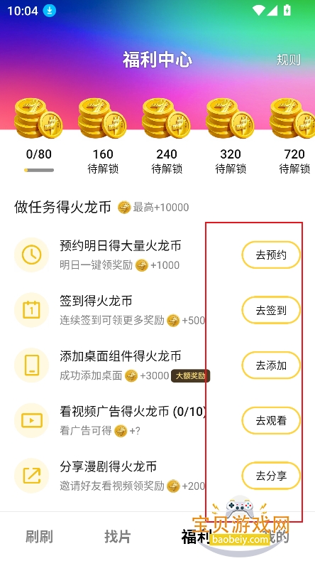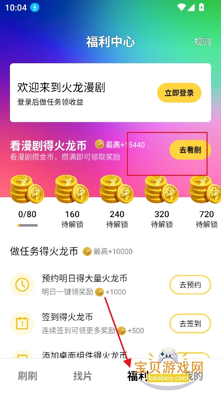 1、进入【福利】界面,可以点击【去看剧】完成看剧任务,领取金币