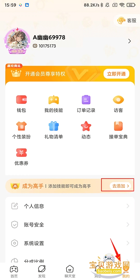 1、在小鹿组队电竞陪玩APP点击【我的】-【成为高手】-【去添加】;