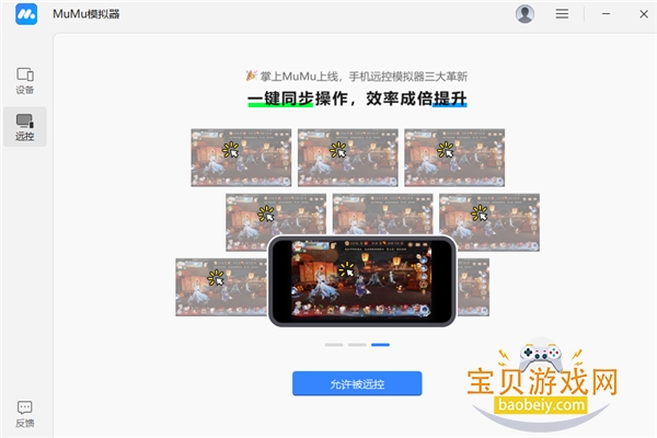 进入模拟器主窗口的「远控]标签页,确认“允许被远控“权限已开启,并连接服务器成功。