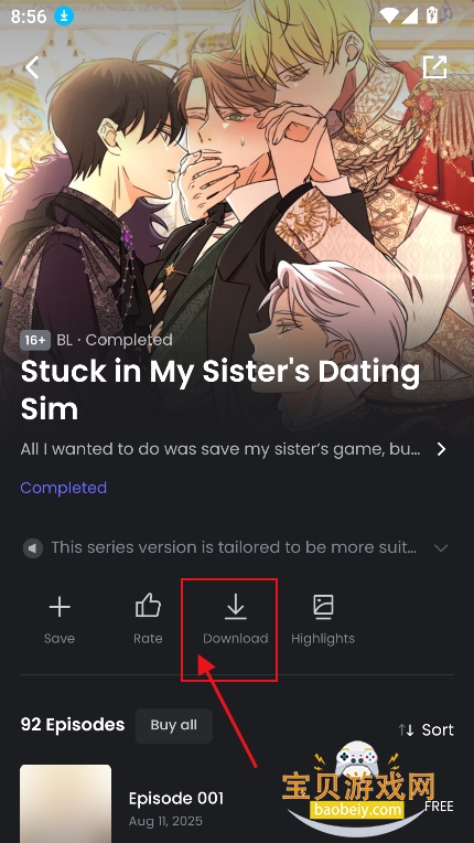 1、进入喜欢的漫画界面,点击【下载】图标