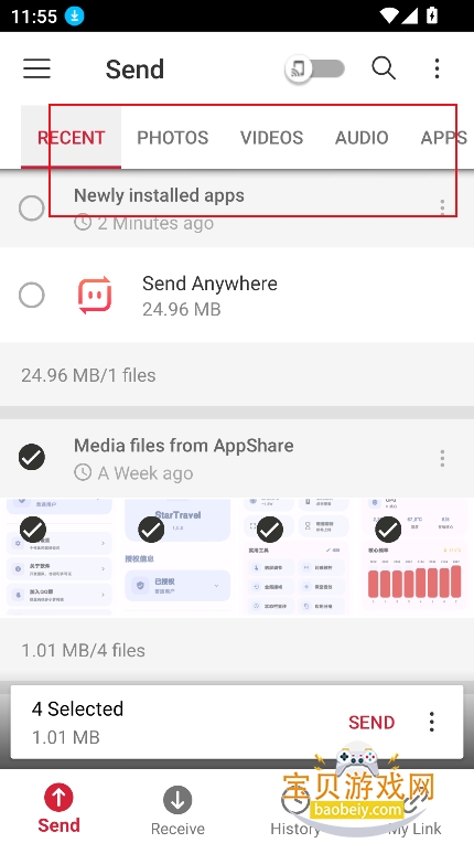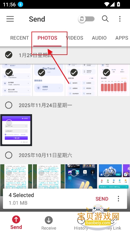 2、例如选择【照片】勾选图片文件,点击右下角【send】