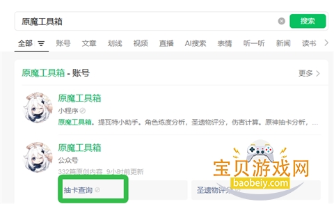 7、然后打开微信搜索【原魔工具箱】,点击【抽卡查询】。