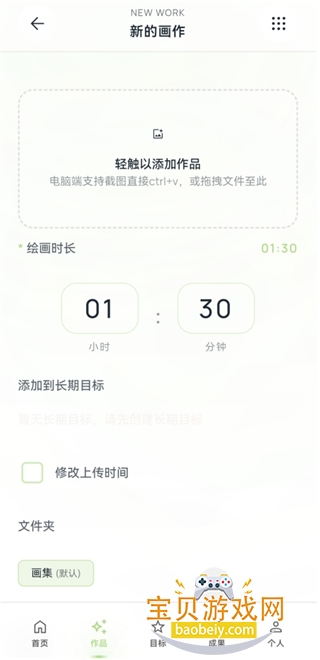 2、点击上方虚线的区域添加作品,你可以设置绘画时长。