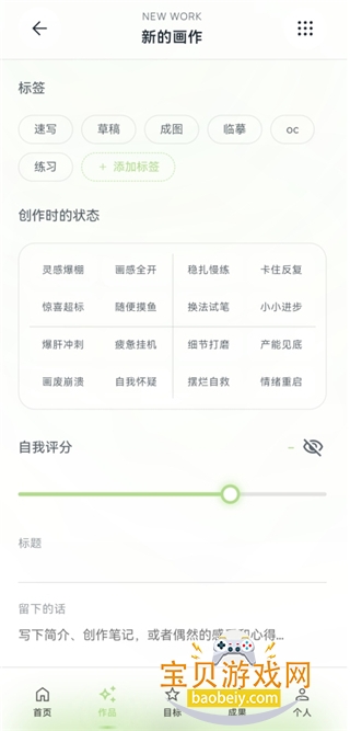 3、滑到最底下可以给这张画添加标签、创作时的状态、自我评价、标题等内容,都设置好后点击保存。
