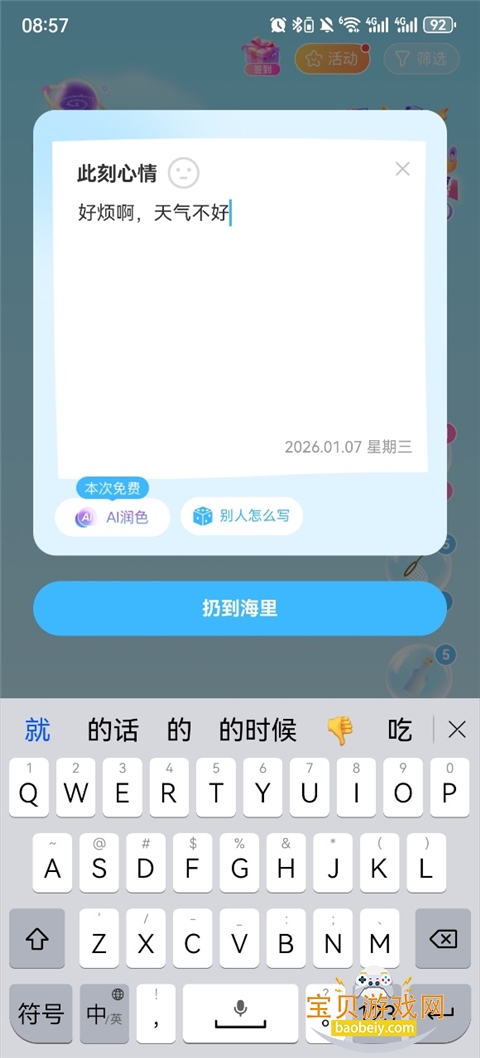 3、输入你需要说的烦恼以及生活中的情绪,点击扔到大海;