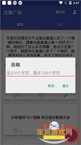 4、下方的加号选项,用户可以进行文案投稿,把你喜欢的文案或者心中自创的美句发表出来让大家欣赏。