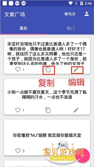 2、即可看到许多热门文案,点击中间的复制选项可以复制文案。