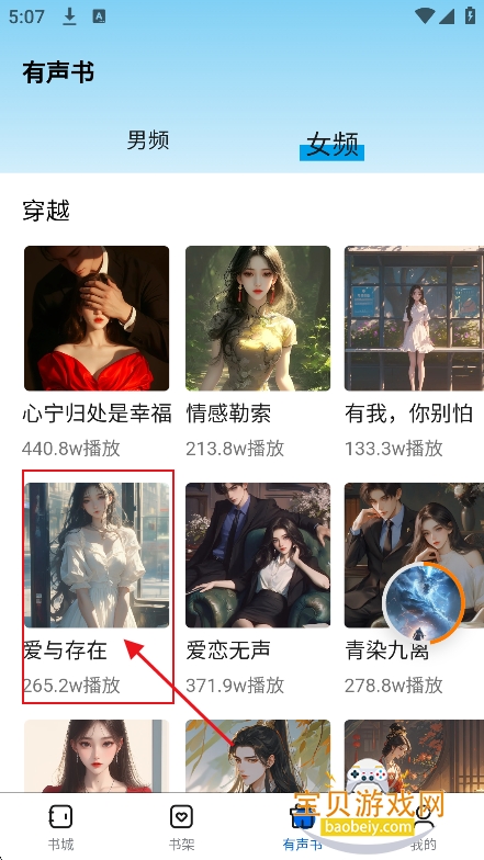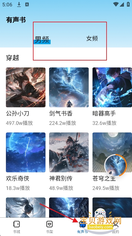 1、进入【有声书】板块,筛选男频女频小说类型