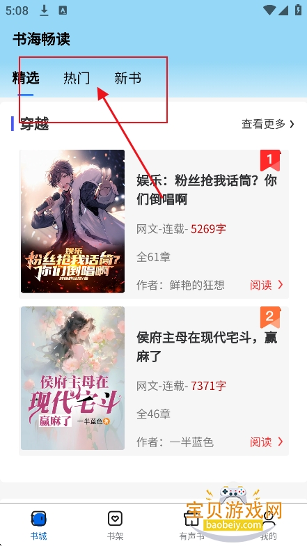1、进入【书城】板块,可以查看最新,最热,精选书籍内容