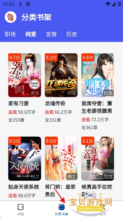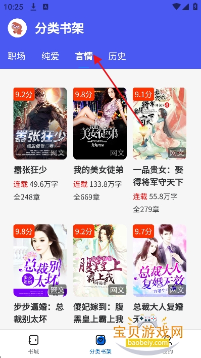 2、进入【分类书架】可以筛选喜欢的小说题材,分类等