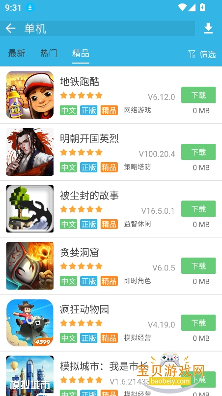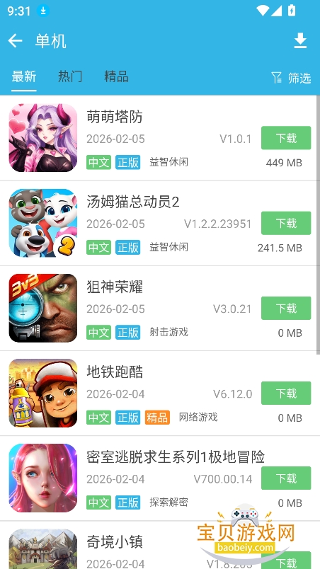 2、例如进入单机界面,提供最新,精品,热门的游戏资源
