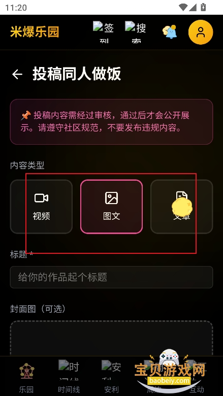 米爆乐园支持发布原创内容与同人创作(图文、相关素材等),操作简单易懂,步骤如下,新手可快速上手: