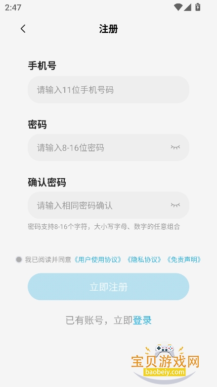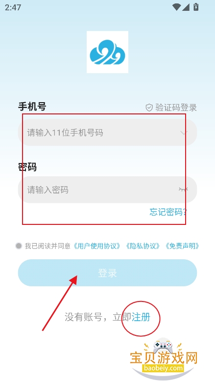 4、新用户直接点击注册,进入注册界面,完成账号注册
