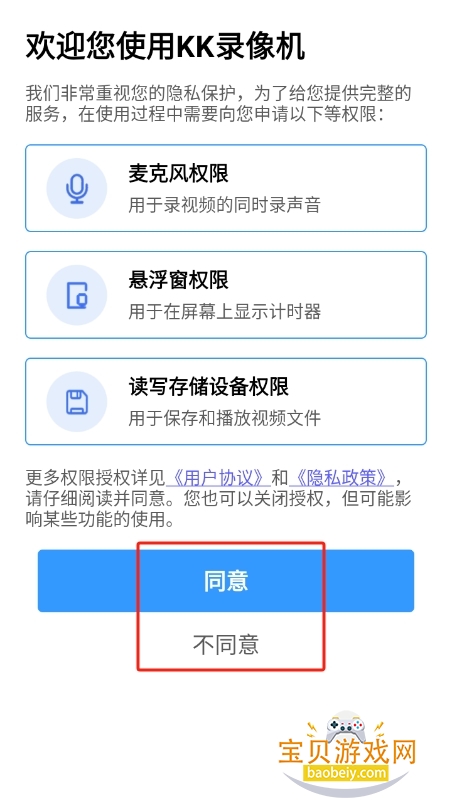 1、在本站下载安装KK录像机app,进入后我们同意KK录像机app的用户协议;