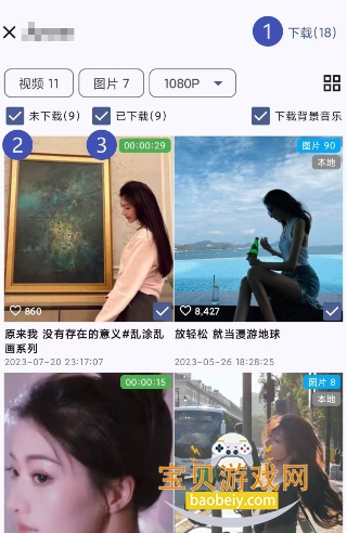 6、用户作品页面,可快速筛选视频和图片,一键下载多个作品,上滑可加载更多作品